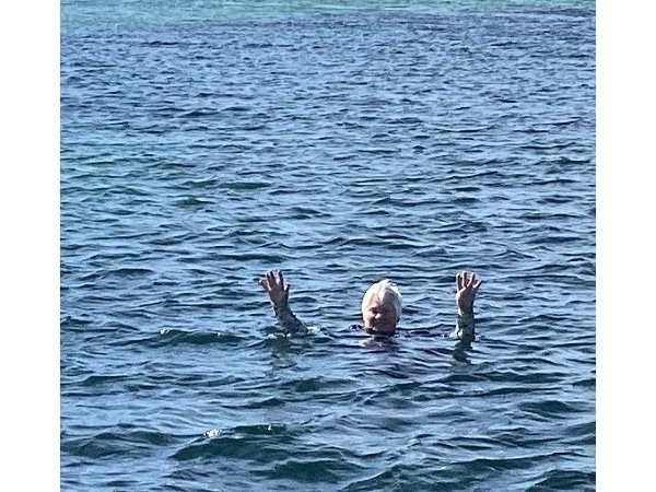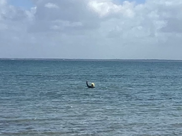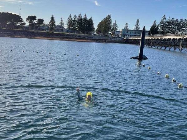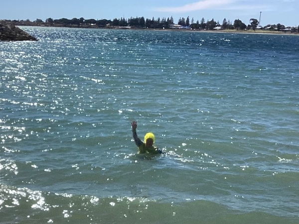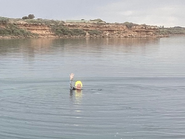 A nice day day for a dip at Pinky Point, Thevenard, sun’s shining, temperature is 17 and water temperature 13. Three more to go.