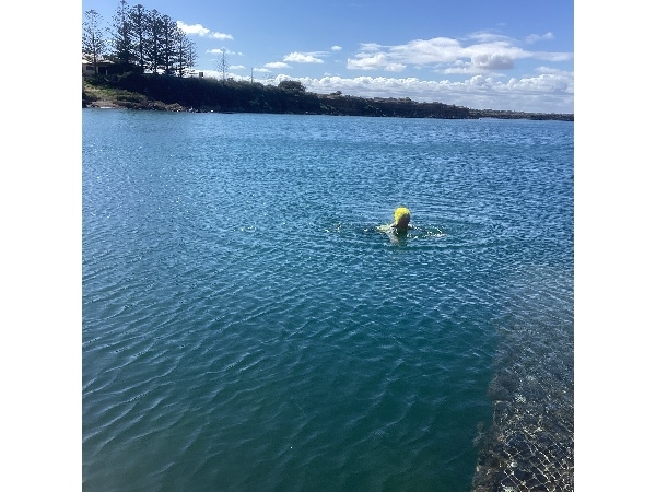 Sunny today, currently 18 degrees but quite windy, 30 - 35 km, found a sheltered spot for a quick dip at the Puckridge rock jetty. 2 more to go.