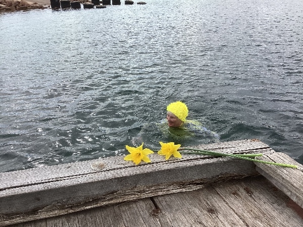 Headed to Thevy slip today for a bit of shelter from the 35+km wind blowing from the north. Water temperature was 15 and air temperature 22. Looks like Spring is not far away .One more dip to go.Forgot my lovely daffodil cap so am wearing my silver mop.