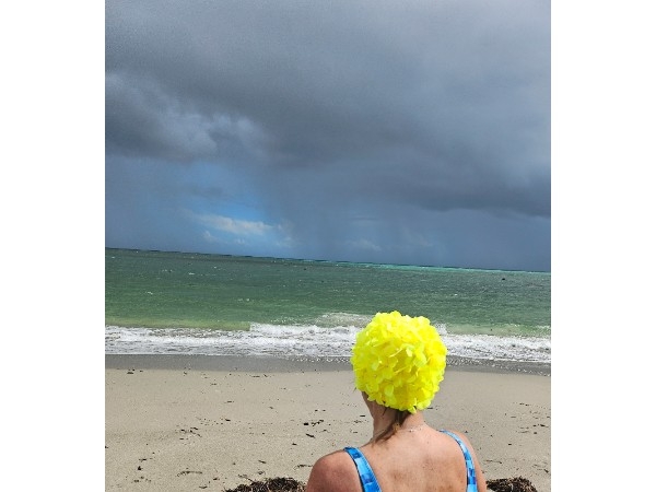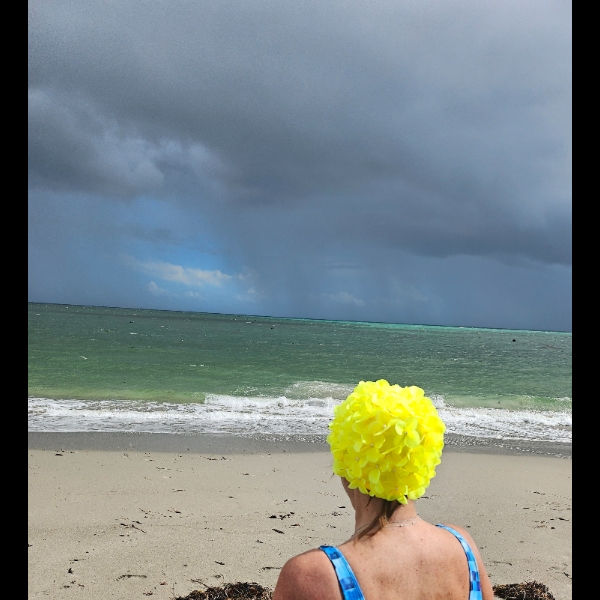 It was stormy!!! managed to get in the water before getting wet by the rain ๐Oh and the Daffodil cap arrived in the post yesterday, just in time to make it's inaugural dip today.