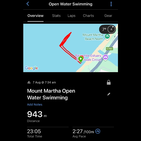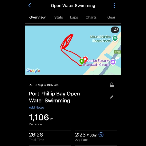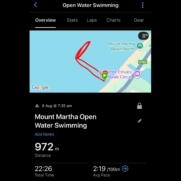 First dip (swim) 1st of 15. 'Cool' this morning at Mt Martha VIC. Air temp: 5 deg, Water temp: 9 deg. Brrrr!